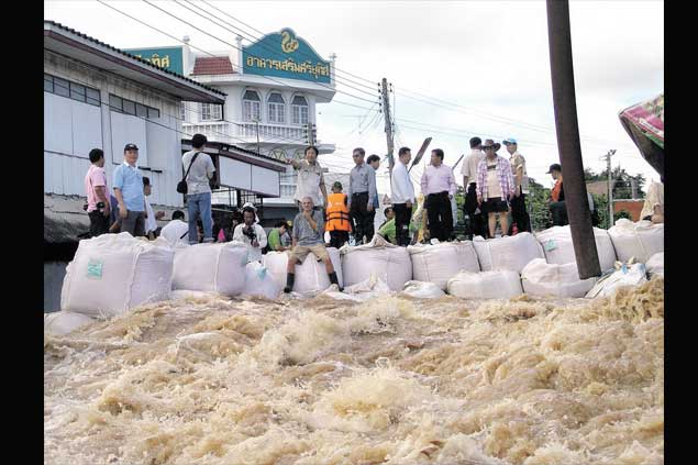 Anwohner, freiwillige Helfer und Behörden errichten am Wochenende eine “Big-Bag” Barriere in Sukhothai
