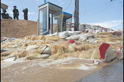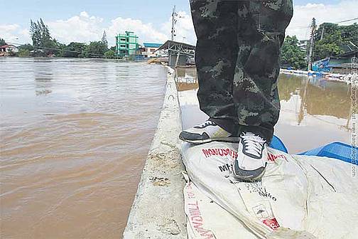Der Yom Fluß hat seine Obergrenze erreicht und drückt gegen die Sandsäcke